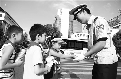 昨天,绍兴市区气温达到37℃,绍兴市鲁迅小学一(7)班的冯懿倩小朋友和伙伴们为执勤的交警叔叔送去了冰镇的西瓜、矿泉水。