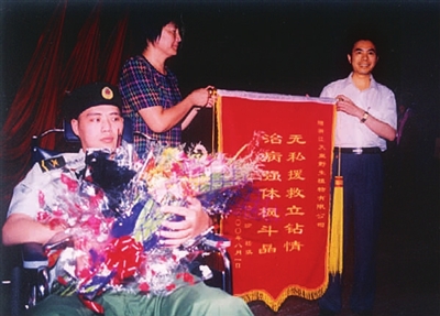抗洪英雄嵇琪的妈妈正向陈立钻(右)赠送锦旗,感谢他多年的关怀