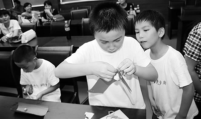 近日,杭州师范大学后勤集团举办了外来务工人员员工子女夏令营。夏令营为期一个月,以“爱国教育、快乐生活”为主题,组织“小候鸟”们参观博物馆、看3D电影,还为孩子们开设了游泳、球类、手工等文化体育课程。图为孩子们在手工课上动手学做小红旗。