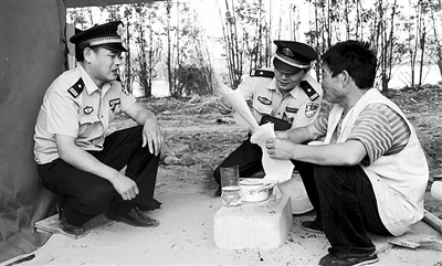 不一会儿,老吴和小肖的制服就已湿透了。即便是在这样的高温下,民警们每天做的仍然是工地检查、安全隐患排查、安全施工宣传教育……