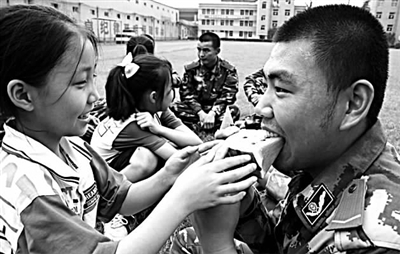 昨天是今年入伏的第一天。在武警浙江总队直属支队警营,参加先锋少年欢乐军旅夏令营的21名小朋友刚刚度过了一周颇有意义的军事化假期生活,即将离开这里。在依依惜别之际,孩子们手捧可口的西瓜来到部队的哨台和训练场,给武警叔叔送上清凉。