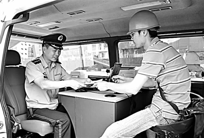 “移动警务车把边检服务关口移到了船边,给我们带来了不少方便,我们都喜欢管它叫‘服务直通车’!”此举得到了不少船务代理公司代理人员的称道。图为手续办理完毕,检查员把相关单证交还代理手中。