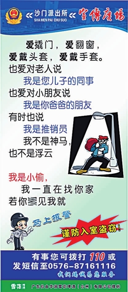记者了解到,玉环县灵门海鲜城里的防范知识宣传板确实做得与众不同。有调侃市民的“:安全防范意识差的人大家伤不起啊!外出游玩、走亲访友,因为没关好门窗,家里贵重物品被盗的,有木有啊!有木有!”