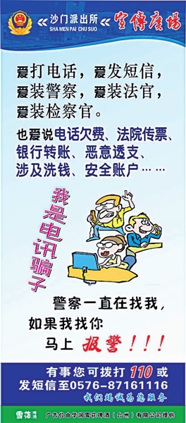 做出这个防范宣传板的是玉环县公安局沙门派出所的民警。所长方强国说,传统说教式的宣传方式,不能给群众留下深刻的印象。他们想有所创新,用当下年轻人最喜欢的语言方式加上卡通漫画,生动形象地做一些防范宣传。