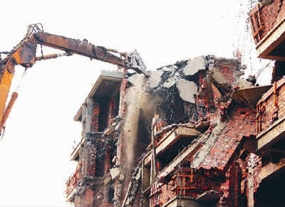 一辆大型破拆机缓缓开进正在施工的“汇景嘉园”小区。小区里面,几辆破拆机正在拆除几栋刚刚建成、已经封顶的住宅楼。伴随着震天的噪音,巨大的墙壁碎块从高空落下 ……