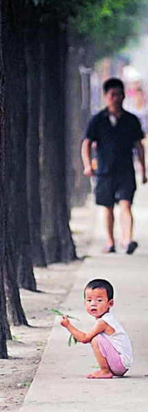 见到龙龙,是在杭州拱墅区祥符街道新文村的马路上。他只有3岁,一个人蹲在路边,手里玩着几片树叶,浑然不觉路上的危险。