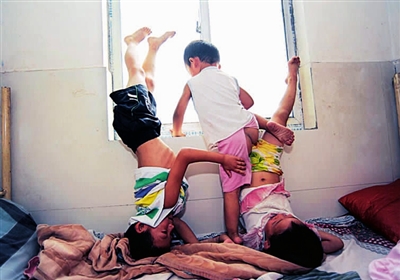 我跟着龙龙去了他们暂住的地方。在家里,3个孩子彻底放开了,在床上乱跳。床就放在窗户下面,顽皮的云云很快在窗口玩起倒立,露露也跟着学,最小的龙龙突然爬到他们的身上,试图通过他们爬上窗台。此时,窗户关着。我说:如果窗户没关,你们会掉下去的。3个孩子脆生生地回答:不怕!