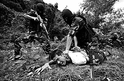 昨天,台州市公安边防支队特勤分队在温岭城南山区举行特警战术和反恐技能实兵演练。这次演练根据沿海丘陵地形和夏季气候特点,重点突出丛林围堵、抓捕控制、武力突袭等课目,检验和提高部队机动作战和反恐能力。图为特勤官兵抓捕控制“恐怖分子”。