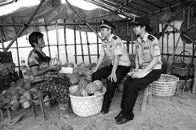 7月19日下午,台州市公安局黄岩分局北洋派出所民警来到百亩洋村西瓜种植园,在瓜棚里边和瓜农们唠家常边了解治安状况,并向瓜农宣传夏季治安防范知识。