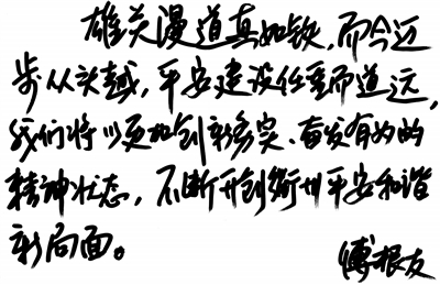 在接受本报记者专访后,傅根友书记专门写下了一段话,勉励全市平安建设者,寄语衢州平安建设不断开创新局面。