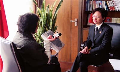 最高人民法院院长王胜俊(右)正在听取江干法院院长叶青(左)汇报