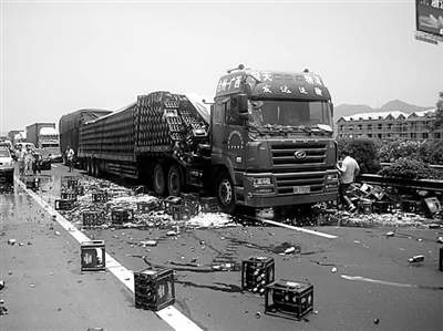 风叶蓝草:啤酒飞出去了?太阳伞:车上约500箱啤酒发生了倾移,并压倒了车体前面的挡护板,大约有100多箱(1500多瓶)啤酒散落到了地面。