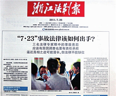 《7·23事故法律该如何出手?》,7月26日《浙江法制报》头版头条引发微博热议,三位法律专家从法律角度畅言事故善后。中国计量学院法学院院长杨凯表示,人为因素很难完全排除,可能涉及刑法中规定的多个罪名。省律协刑委会副主任徐宗新也表示,如果动车本身存在技术问题却投入使用,相关人员涉嫌玩忽职守罪。而省律协民商专业委员会主任叶明从民事赔偿责任角度出发发表了自己的看法:“国务院条例规定的赔偿限额太低,存在不合理性,应该适用《侵权责任法》进行赔付。”