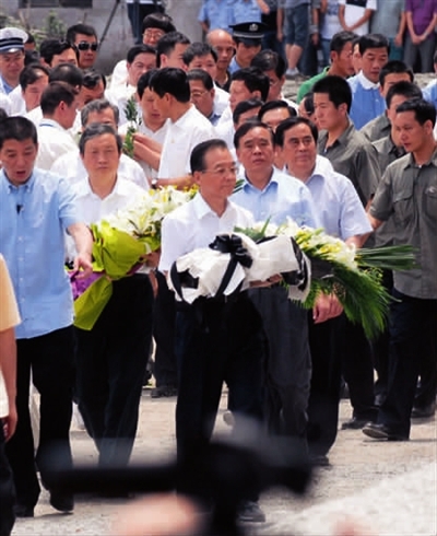 7月28日,中国国务院总理温家宝在温州察看“7·23”甬温线特别重大铁路交通事故现场,悼念遇难者,看望受伤人员,对伤亡人员家属表示深切慰问,并回答中外媒体记者的提问。
