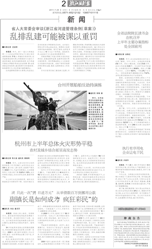 本报讯昨天,省十一届人大常委会第二十六次会议听取并审议了《浙江省河道管理条例(草案)》。草案结合本省实际,对河道管理范围内禁止和限制的行为进行了创设性规定,如向河道排放泥浆、在行洪道内建设从事餐饮等商业活动的移(浮)动或者固定的构筑物、建设阻碍行洪的建筑物、构筑物等行为,均在草案中被明确禁止。