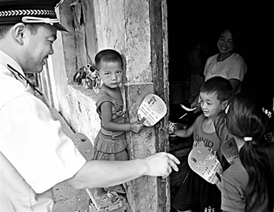 针对夏季儿童溺水多、“两盗”案件和电信诈骗多等社情,近日海盐县公安局沈荡派出所民警来到新居民众多的辖区齐家砖瓦厂,向他们分发印有安全防范知识的小扇子。民警还特别针对新居民子女进行防溺水安全宣传。