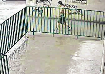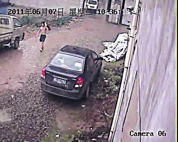 6月7日上午10时35分,案发现场附近一幼儿园的监控里,出现一可疑男子,他上身赤膊,下身穿深色短裤,右手提着疑似黑色笔记本电脑包,左手用黄色衣服遮住脸,正匆忙往外奔走。