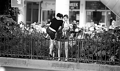 昨天上午,在杭州钱江小商品市场附近,两名妇女抱着小孩过马路。她们没有走天桥,偏偏艰难地翻围栏抄近路,非常危险。