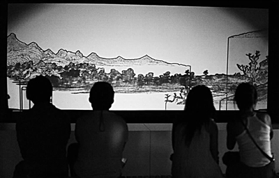 8月2日至9月5日,“山水合璧———黄公望与《富春山居图》特展”第二期将在台北举行。此次展览展品包括曾被乾隆皇帝误以为真迹的《富春山居图》(子明卷)等数十件,同时还使用多种媒介向参观者展示黄公望及其艺术成就。 图为8月2日,参观者在欣赏多媒体作品“听画”,感受《富春山居图》在构图上如同交响乐般的感觉。