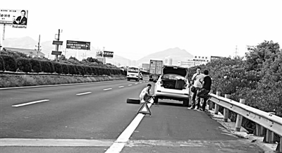 日前,一辆河南牌照的轿车行驶至沈海高速台州路段时左后轮爆胎,司机将车靠边后,也不报警,而是将一只备用轮胎放在慢车道上,在车后10米处放三角标志,自己则蹲在慢车道上换起轮胎来,后方车辆经过时纷纷刹车避让,十分危险。