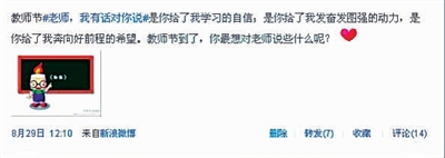 在教师节这个充满鲜花、掌声的节日里,你有什么心里话要对老师说么?在第27个教师节来临之际,浙江法治在线新浪官方微博刚一发布这个话题,就引来了众多粉丝的跟帖,字里行间流淌着浓浓的温情。