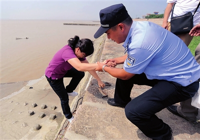 “等一下,我们再拍两张照。”看见张峰他们赶来,5名上海游客还舍不得走。“要赶紧了,这里危险。”张峰有些焦急。游客有点不好意思,收起了相机。张峰挺高兴,帮忙把他们一个个拉上海塘(如图)。但是,丁字坝上还有一个人悠闲地坐在一张小板凳上。“他是来网鱼的。”张峰很有经验地说“,他胆子比一般游客大多了。看我的,我去把他请回来。”张峰再次爬下海塘,跑到那渔民面前。这招果然厉害,在张峰一遍遍的“唠叨”下,这个渔民开始收网。“不能硬来,只能跟他们讲道理。多讲几遍,他们总会听的。”张峰说。