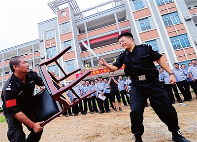 近日,江山市对全市各所学校的120多名校园保安进行分期培训,集中教授保安法律法规、安保器械使用、校园常见突发事件处置等课程。图为江山市公安局特(巡)警大队的警官正在给学员们演示格斗技巧。