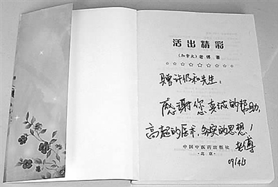 2009年4月中旬,许仍和医生意外地收到了寄自加拿大的由中国中医药出版社出版的《活出精彩》一书,作者老傅不但亲手在扉页写下“感谢您真诚的帮助,高超的医术,务实的思想”的赠言,还在书的前言中这样表述:“尤其要感谢许仍和大夫,从他身上学到了踏实、淳朴的思维方式和行事方法。”
