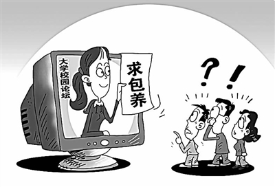 刚上大一的19岁女生任同学近日在大学校园论坛上发帖,“求过而立之年的大叔包养”,并留有联系电话。对此,发帖的任同学称,“包养帖”只是宿舍6人商议后做的一个调查,是为了观察社会,试探社会。就此事,校方表示并不知情,不便发表意见。