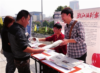 作为第三届浙报集团传媒文化周的组成部分,9月24日上午,本报在杭州汽车城举办读者服务日活动,向读者赠送报纸,提供法律咨询。