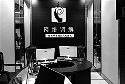 西湖法院二楼有一间网络调解室。这是个小房间,里面有一张别致的“e”型桌子,上面依次安放了4个电脑显示频,正对面的墙上是一块大型的电子显示频。