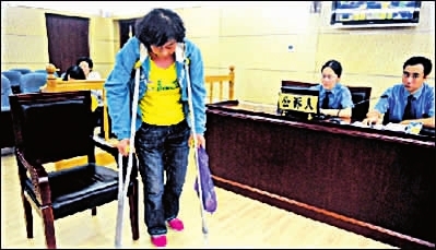 前天上午9点半,被取保候审的张红拄着双拐孤独地站在法庭门口,没有任何亲属陪伴。因患有严重的类风湿性关节炎,行动不便,张红用了1分多钟,才走完从门口到法庭中央这不过10米的路。