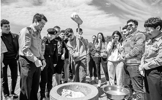“咚、咚、咚!”在金山村文化广场,石臼声此起彼伏。村民现场展示打麻糍技艺,还邀请留学生一起体验麻糍制作。“甜甜的、软软的,很好吃!”印度尼西亚留学生用中文点赞道。许多留学生在朋友圈晒出自己打麻糍的照片,留言“这是最有味道的中国记忆”。