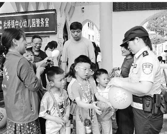 每天上学、放学时间,临海公安杜桥派出所民警辅警都会准时出现在辖区学校门口,站好“护学岗”。“六一”临近,民警和志愿者还为孩子们送上彩色气球,预祝“儿童节快乐”。