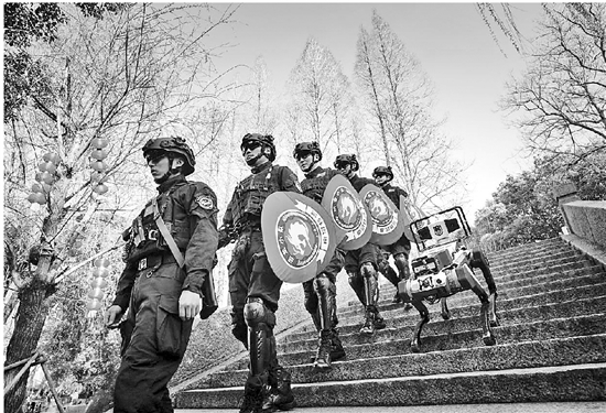 | 巡特警大队“迅龙小队”与机器狗协同巡逻 |