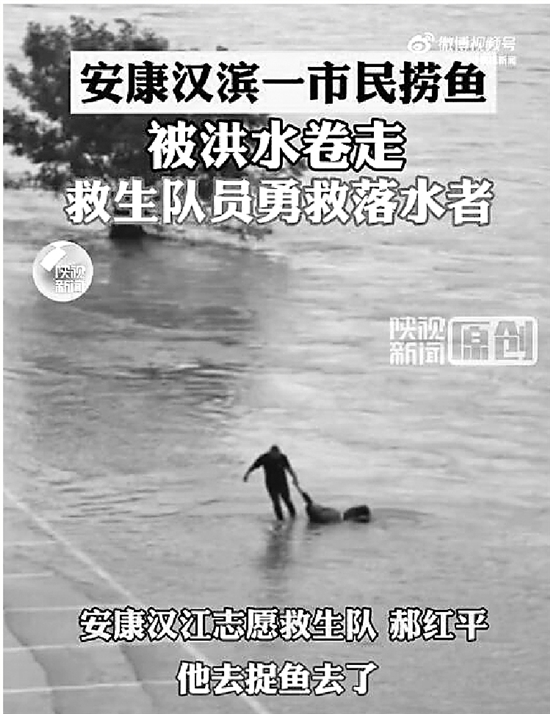 近日,陕西安康市汉滨区中心城区的汉江一桥前,一市民在江边捞鱼时不慎被洪水卷走,在附近的汉江志愿救生队员郝红平面对汹涌的江水,没有丝毫犹豫,纵身跃入激流,将落水者拖回岸边。