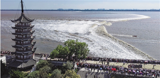 10月9日,农历八月十八,正值钱江潮最佳观赏日。海宁盐官观潮胜地公园,“一线潮”自东奔涌而来,蔚为壮观。海宁海塘全线,超14万观潮游客争睹“天下第一潮”。