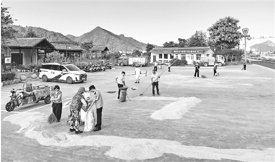 近日,三门县公安局横渡派出所民辅警在工作之余,主动帮助周边农户抢收晾晒好的稻谷。连日来,该所主动将警营前的水泥地坪腾出,供农户使用,解决晒谷场地不足问题,确保秋粮顺利归仓。