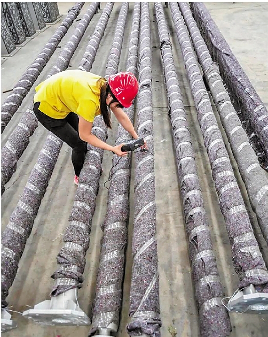 | 质检人员在对智慧灯杆杆体进行质量检查 李晓果 摄 |