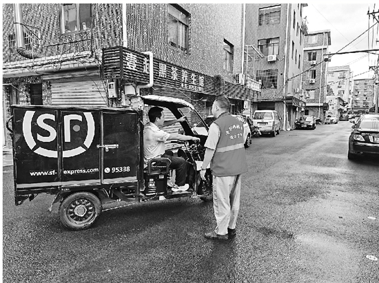 | 快递小哥向网格员报送社区风险隐患 |