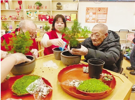 | 在北京市丰台区北宫镇养老服务中心,志愿者手把手教老人制作“松鹤延年”盆景。(新华社 夏子麟) |
