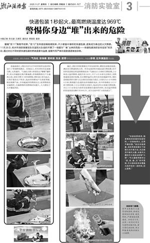 随着“双11”购物节结束,“双12”及年底促销陆续到来,不少家庭中堆积的快递包装,逐渐成为身边的火灾隐患。11月26日,杭州市消防救援支队在富阳大队组织开展了一场题为“‘堆’出来的危险——快递包装消防安全实验”的活动,通过对比不同材质快递包装的燃烧速度与温度,提醒市民严禁在疏散通道堆放杂物。