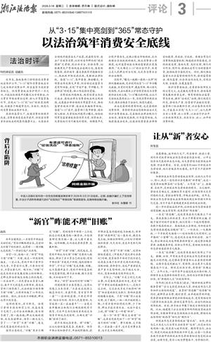 保护消费者权益,是尊重和保障民生的应有之义,也是激发消费活力、推动高质量发展的重要支撑。唯有坚持依法监管、常态长效,摒弃“运动式”治理,强化制度化约束,推动生产者、经营者守法诚信经营,监管部门依法履职尽责,社会各界共同参与,才能真正实现“天天3·15”,让人民群众安心消费、放心消费,以法治守护公平、以长效保障民生,共筑安全、放心、公平的消费环境。