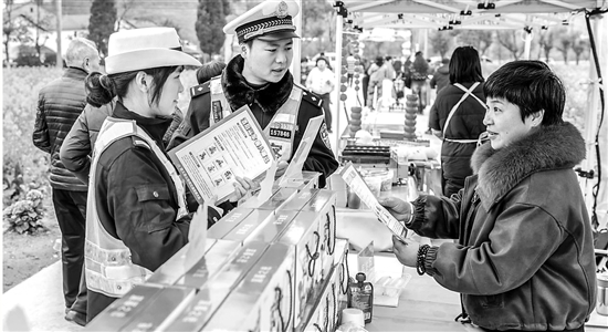 近日,武义县公安局交管大队民辅警来到大田乡田园共富市集,向商家和赏花游客开展交通安全宣传,护航赏花季群众平安出行。