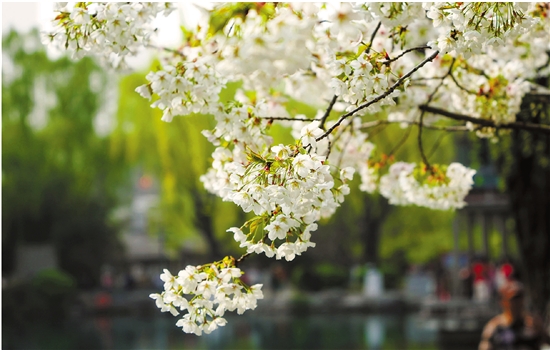近日,山东省济南市气温回升,五龙潭公园内大面积种植的樱花进入盛开期,吸引众多市民前来观赏。