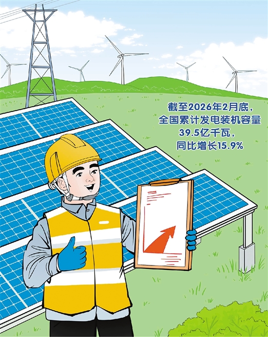 记者近日从国家能源局获悉,截至2026年2月底,全国累计发电装机容量39.5亿千瓦,同比增长15.9%。