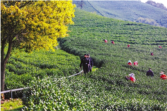 3月26日,2026年安吉白茶正式开采。嫩芽初绽,茶香待品,在这片生机盎然的画卷中,一抹抹“警察蓝”与“志愿红”穿梭其间,守护着忙碌的采茶人。