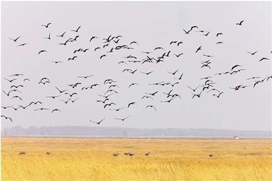 | 在黑龙江省齐齐哈尔市克钦湖湿地拍摄的白头鹤与大雁。 |