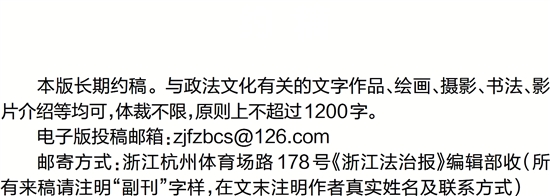 邮寄方式:浙江杭州体育场路178号《浙江法治报》编辑部收(所有来稿请注明“副刊”字样,在文末注明作者真实姓名及联系方式)