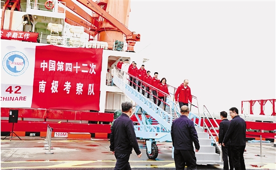 | 4月9日,历时160天、航程3.4万余海里,执行中国第42次南极考察的“雪龙”号,凯旋归国。550名队员、常规物资补给量超3600吨、内陆考察104天,人员规模和任务量等再创新高;热水钻探刷新世界纪录,国产新装备挺立极寒……这支队伍交出一份中国极地探索能力跃升的答卷。 新华社 张建松 摄 |